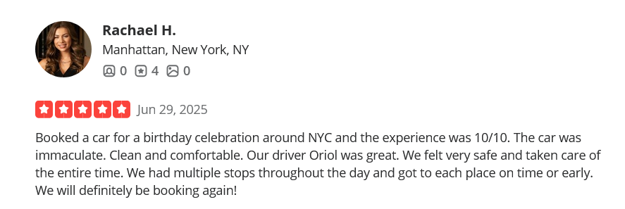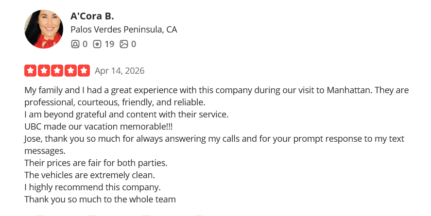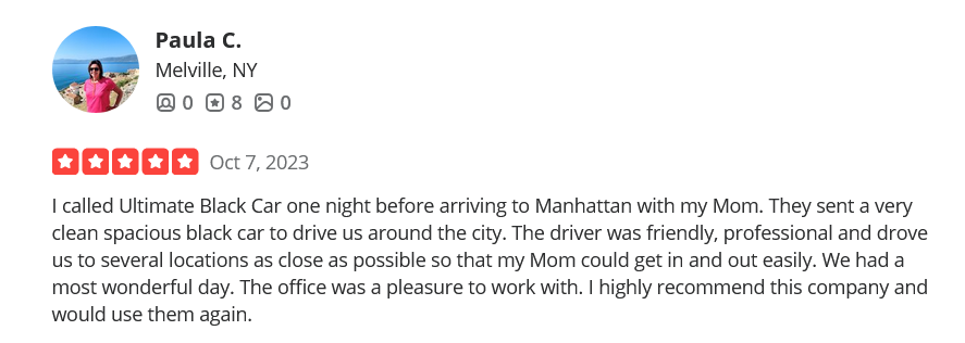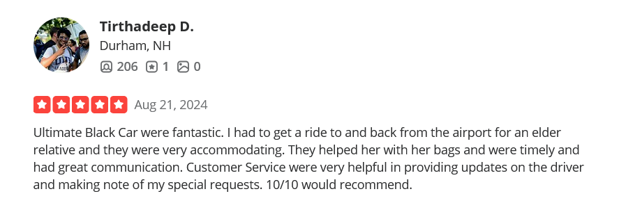 I have been riding with ULTIMATE BLACK CAR since mid july’2018. The drivers are on time,cars are clean, treated with respect, pleasant ride, an go the EXTRA STEP helping getting in an out of car. I recommend them.